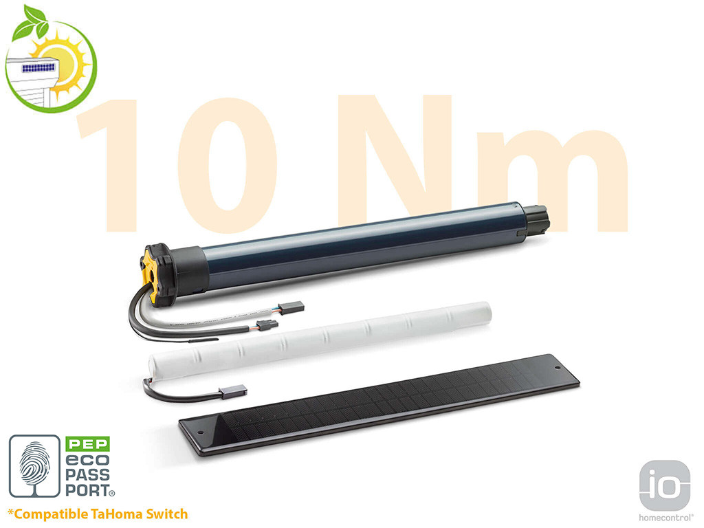 Moteur solaire radio Somfy Io RS 100 10nm 15 tours, diamètre 50, avec programmation automatique des fins de courses. Permet d'équiper vos volets roulants sans travaux de raccordement électrique. Moteur silencieux bi-vitesse avec ralentissement en fin de cycle pour un maximum de confort, détection d'obstacle et protection au gel. Le kit comprend le moteur, le panneau photovoltaïque et batterie.